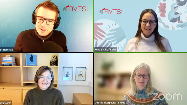 I panelet finner du Rona Eriksen Andersgaard (spesialrådgiver, RVTS Øst), Steinar Hvål (Psykologspesialist, RVTS Vest), Eva Mørch (Psykologspesialist, V27, Betanien Sykehus) og Oddfrid Skorpe (Psykolog, RVTS Midt).
